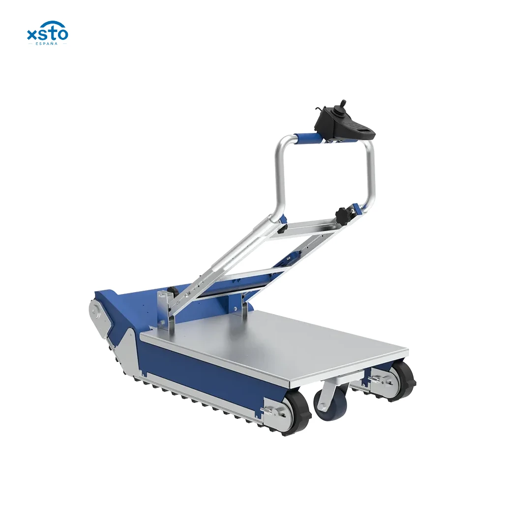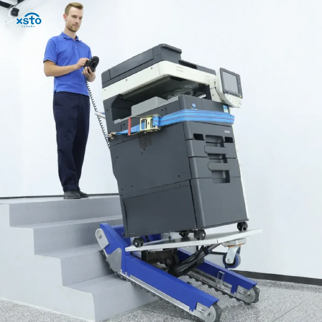 El XSTO CT310 es un sube escaleras eléctrico de oruga diseñado para facilitar el transporte de cargas pesadas en escaleras. Entre sus mejoras destacan dos motores potentes, orugas independientes antideslizantes que no dejan marcas, y un tablero de carga inteligente que se adapta automáticamente al ángulo de las escaleras. Su batería de litio recargable y portátil proporciona un funcionamiento silencioso, permitiendo subir hasta 100 pisos con una sola carga. Además, incluye un control remoto por cable y un joystick de manejo sencillo con un dedo. Su capacidad máxima de carga es de 310 kg.